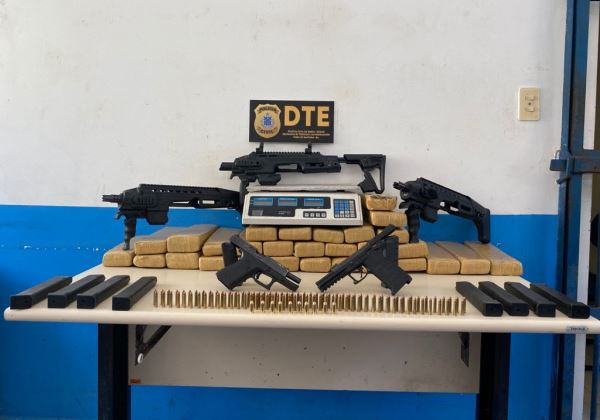 Entre as apreensões em uma casa no bairro Cidade Nova, foi encontrado com um casal, 26 quilos de maconha, 1 quilo de crack, duas pistolas, munições e três dispositivos usados para conversão de pistola em submetralhadora.